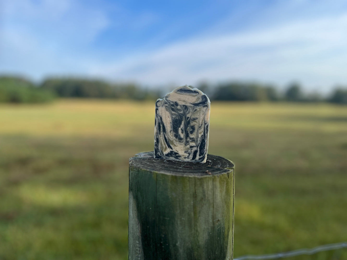 This soap, swirled in black and green, is gently scented with a fall, outdoorsy fragrance.