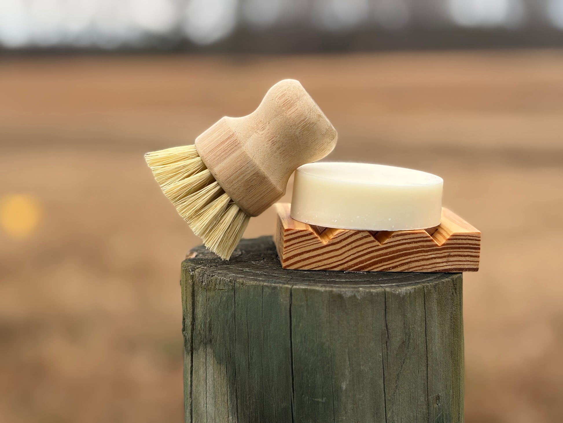 This kit includes 1 lemon dish soap bar, a handmade cedar soap dish, and 1 bamboo dish scrubber.